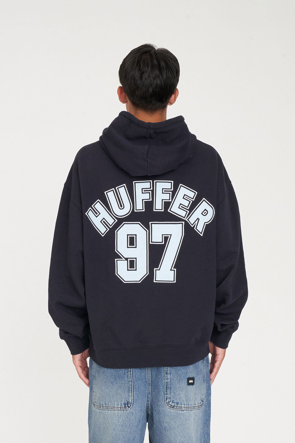 One you'll reach for on repeat. • Boxy fit, ready to throw on and roll out. • What you need to know: 100% Cotton, 350gsm, Mid-weight brushback fleece, Custom Huffer colour, Boxy fit, Kangaroo pocket, Huffer branded hardware, Huffer branded placement embroidery