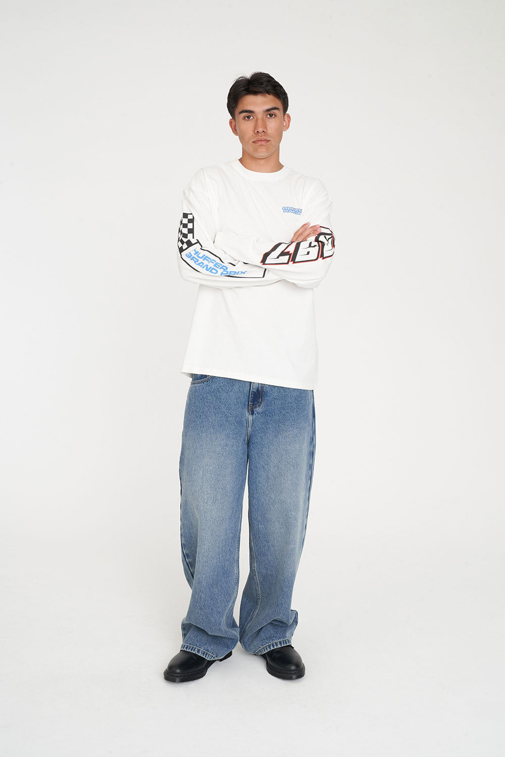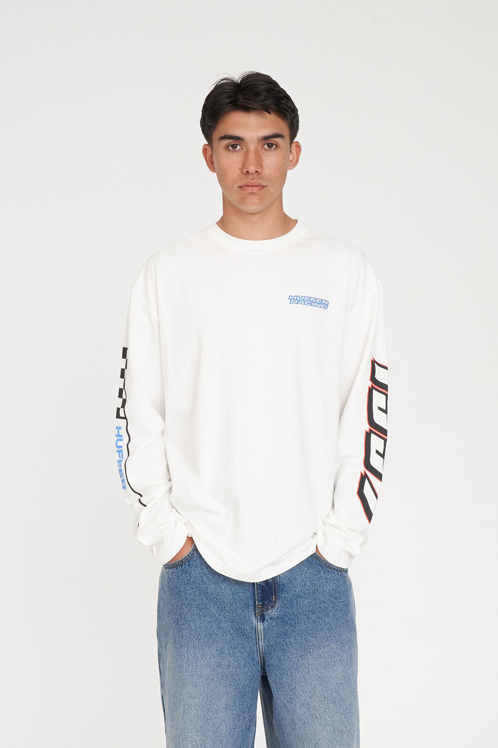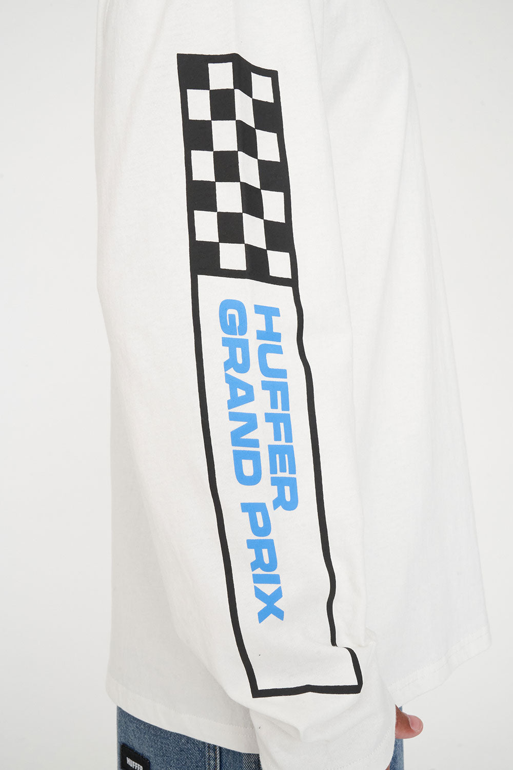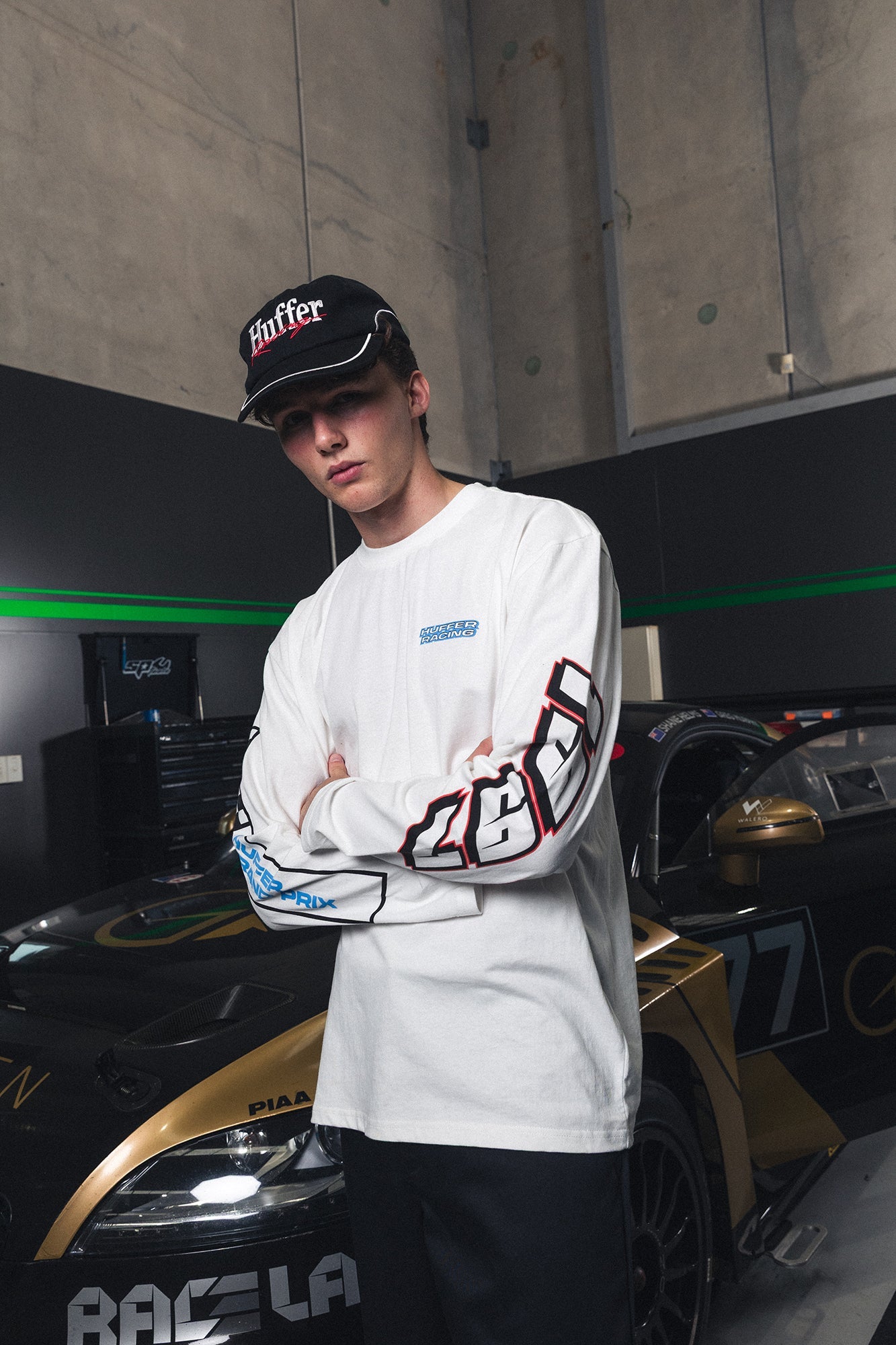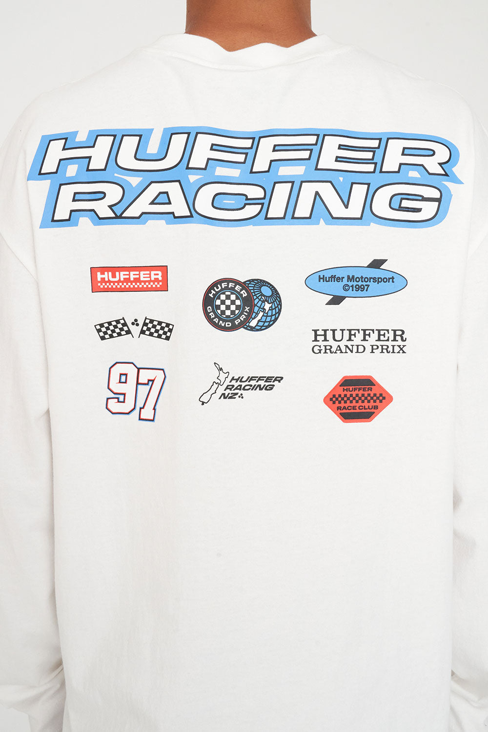 Taking cues from the pit lane. • This one's giving big motorsport energy. • What you need to know: 100% Cotton, 220gsm, 25mm Neck rib, Premium weight jersey, Boxy fit, Long sleeve, Huffer branded placement screenprint & puff print