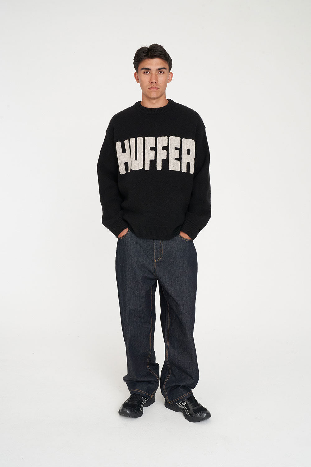 Warm, soft, and way too easy to wear. • Intarsia knit Huffer text, which is just a fancy way of saying "properly knitted in." • What you need to know: 48% Nylon 38% Acrylic 10% Wool 4% Spandex, Fully fashioned knit, Relaxed streetwear fit, Crew neck, Rib sleeve hem and hem, Huffer intarsia branding