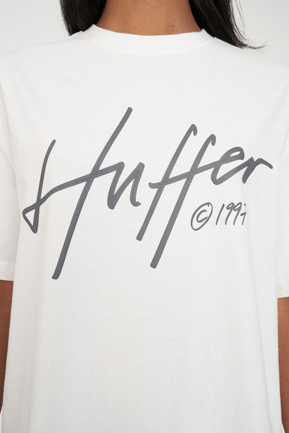 Clean, crisp and made to fool everyone into thinking you put in a lot of effort. • Simple and iconic, just the way it should be. • What you need to know: 100% Cotton, 220gsm, 20mm Neck rib, Premium weight jersey, Boxy oversized fit, Short sleeve, Huffer branded placement screenprint