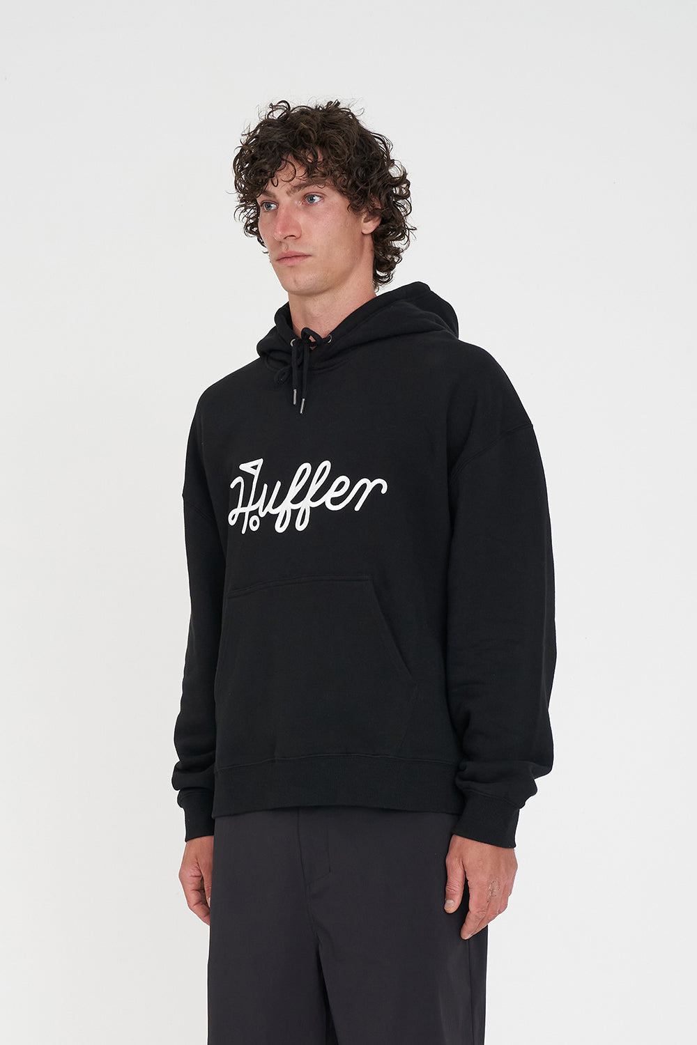 Huffer Golf • Whether you're chasing birdies, bogeys, or simply the vibes, we've dialled in fabrics that breathe, stretch, and stay fresh from tee off to the 19th hole. • Here's what you should know: 100% Cotton, 350gsm, Mid weight brushback fleece, Custom Huffer piece dyed colour, Self lined hood, Patch pocket detail, Striped cuff and hem rib details, Boxy fit, Huffer branded placement embroidered