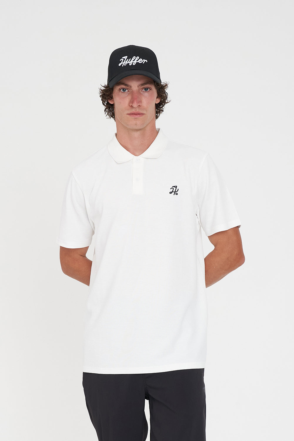 Huffer Golf • Whether you're chasing birdies, bogeys, or simply the vibes, we've dialled in fabrics that breathe, stretch, and stay fresh from tee off to the 19th hole. • Here's what you should know: 60% Cotton 40% Polyester Pique, 245gsm, Soft Handfeel, Standard weight pique, Classic fit, Short sleeve, Rib collar, Button stand and placket, Huffer branded placement embroidery