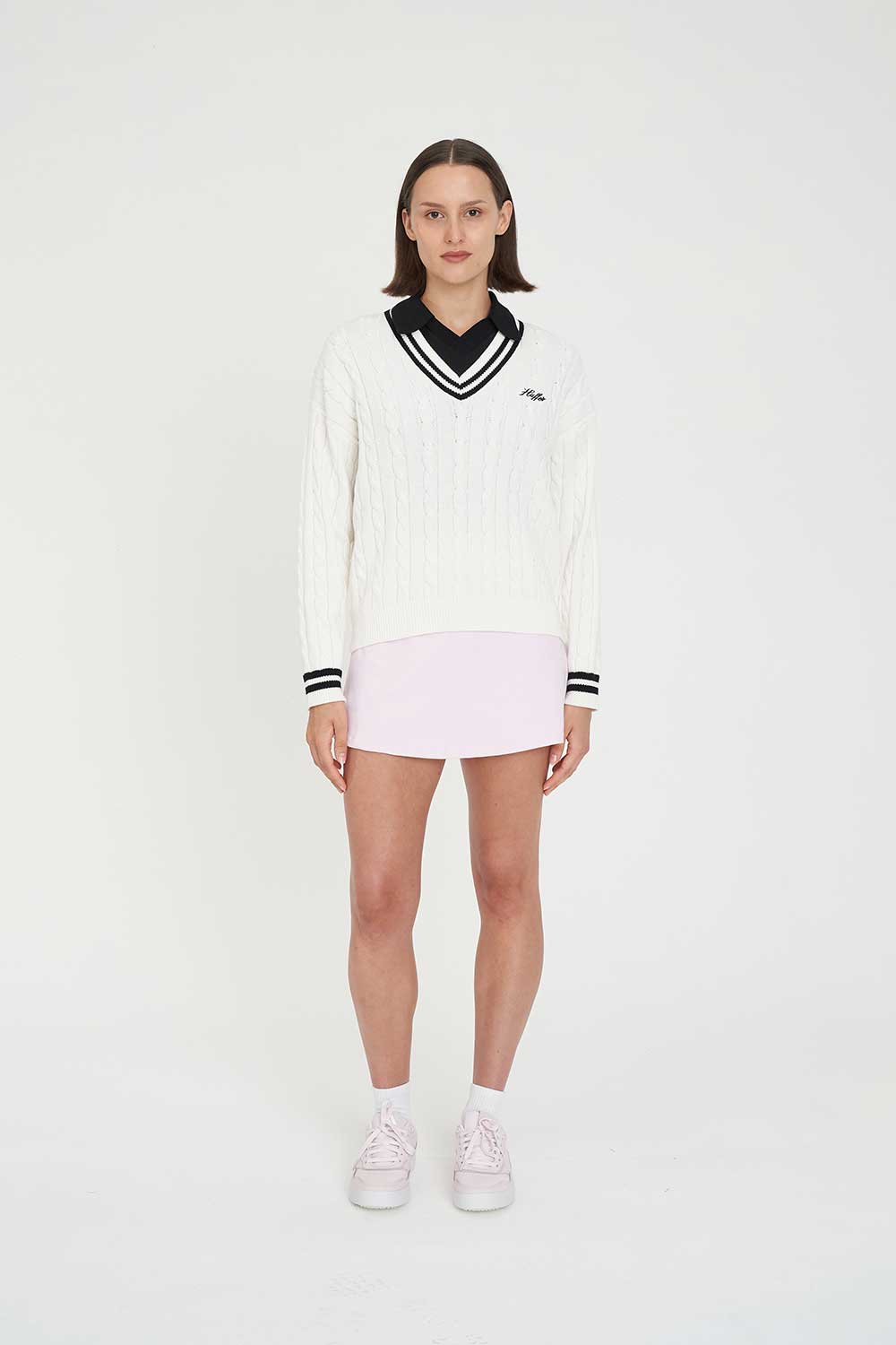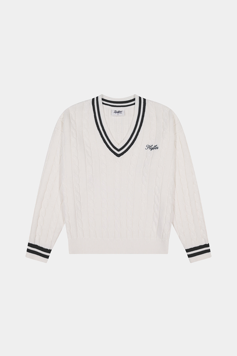 Huffer Golf • Whether you're chasing birdies, bogeys, or simply the vibes, we've dialled in fabrics that breathe, stretch, and stay fresh from tee off to the 19th hole. • Here's what you should know: 100% Cotton, Fully fashioned knit, Custom Huffer stripe, Cable knit pattern, Long sleeves, Huffer placement embroidery, Huffer branded gold metal plate