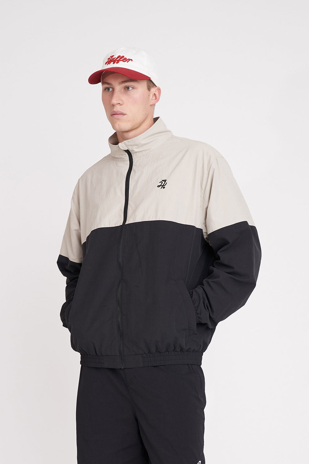 Main: 100% Nylon Lining: 100% Nylon / 105gsm / Wind resistant / Boxy streetwear fit / Mesh lining / Contrast panel detailing / Elasticated sleeve cuffs / Centre front zip opening / Huffer branded embroidery