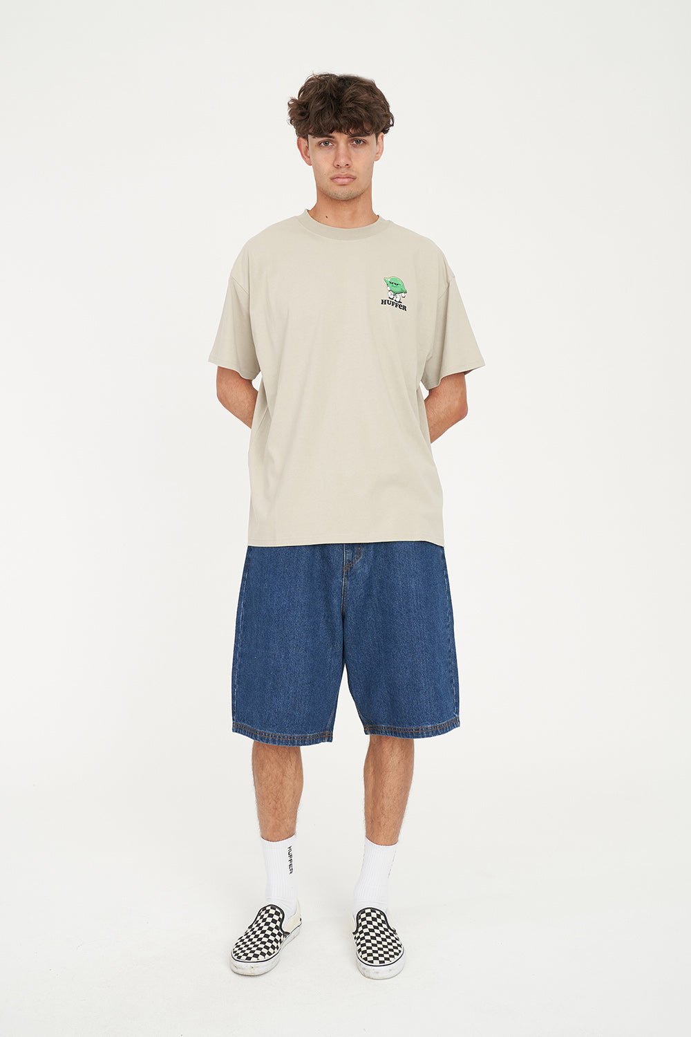 100% Cotton / 220gsm / 25mm Neck rib / Premium weight jersey / Boxy fit / Short sleeve / Huffer branded placement screenprint