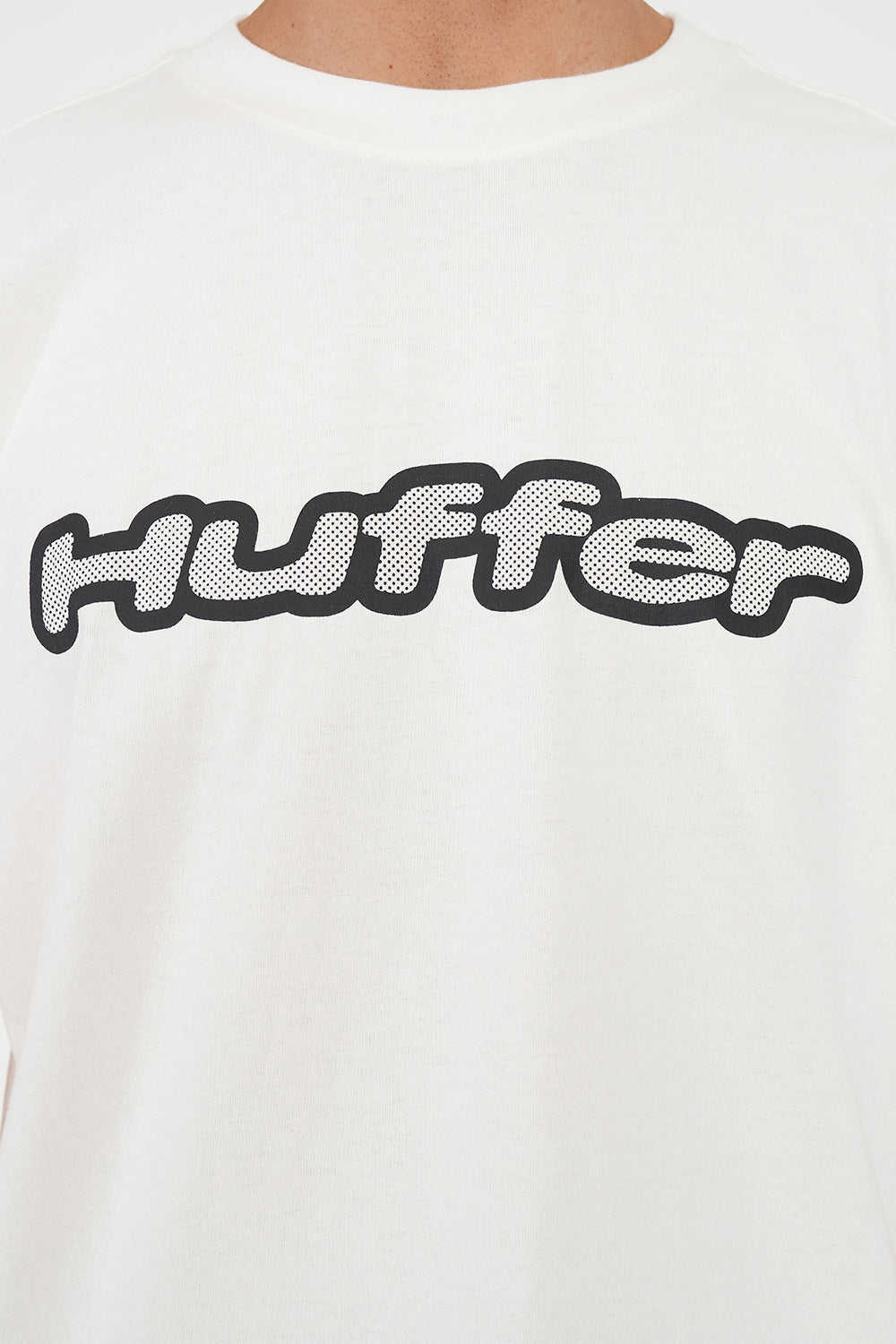 Step out, stand out • Low-key attitude that brings the noise • What you need to know: 100% Cotton, 220gsm, 25mm Neck rib, Premium weight jersey, Boxy fit, Short sleeve, Huffer branded placement screenprint