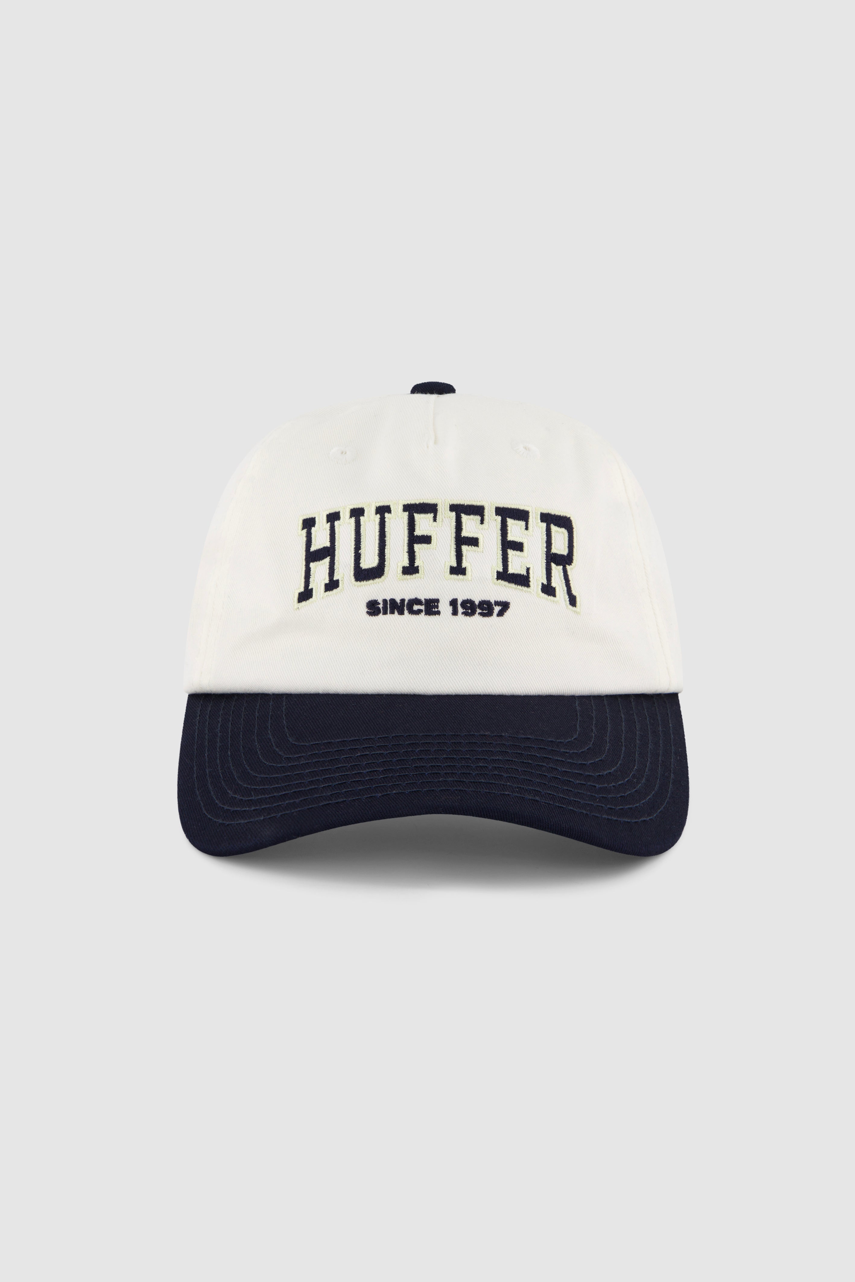 100% Cotton / 5 panel cap / Unstructured / Snap back closure / Semi-curved bill / Embroidered eyelets / Huffer branded placement logo