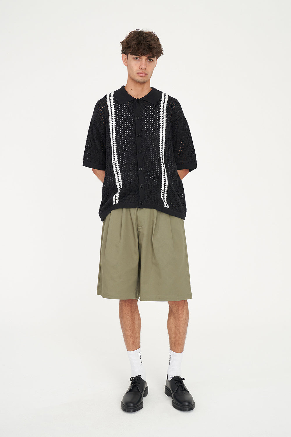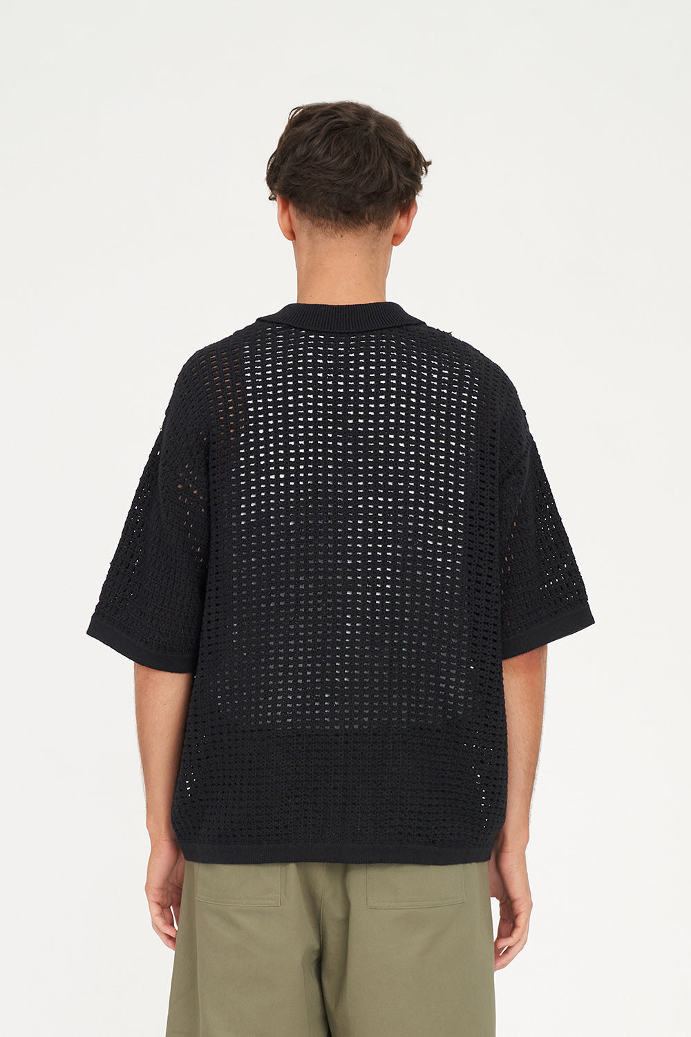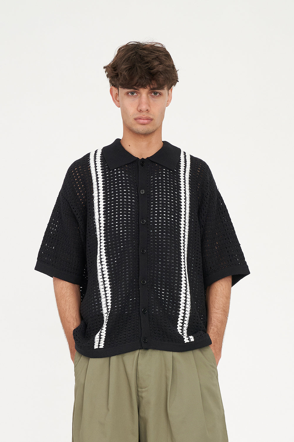 Big strike energy • A boxy fit that's all about ease and attitude • What you need to know: 60% Cotton 40% Acrylic, Fully fashioned, Boxy streetwear fit, Short sleeve, Button front closure, Huffer branded buttons, Huffer branded woven pip