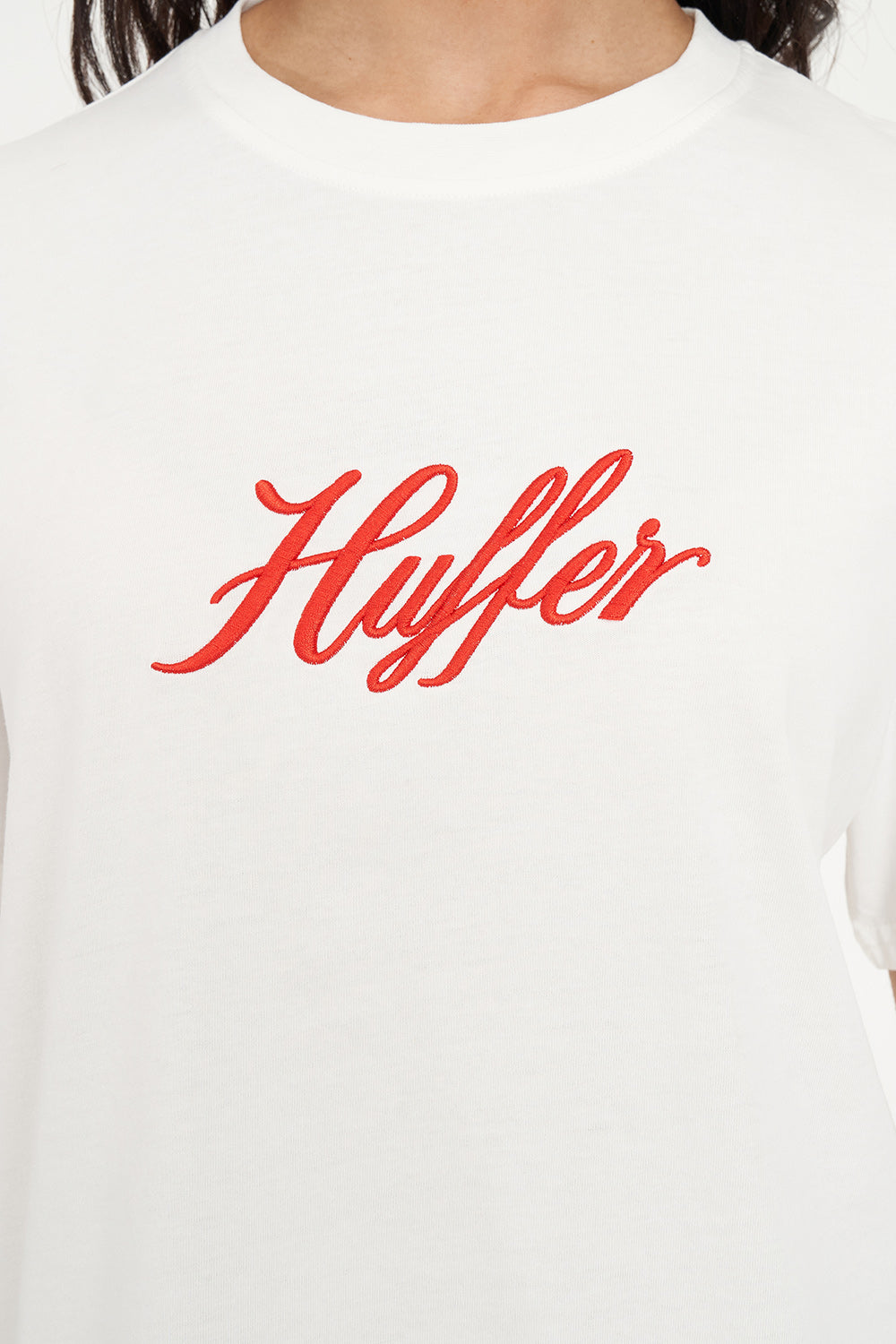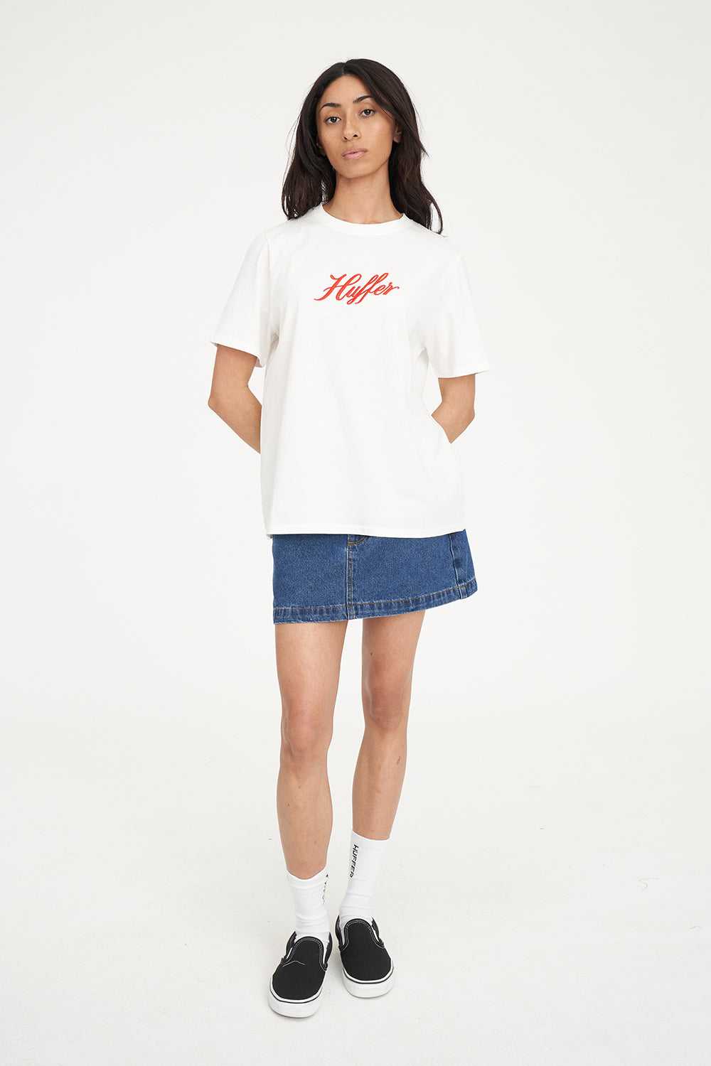 Clean lines, iconic stitch • Built for the everyday • What you need to know: 100% Cotton, 170gsm, 15mm Neck rib, Standard weight jersey, Custom Huffer piece dyed colour, Classic fit, Short sleeve, Huffer branded placement embroidery