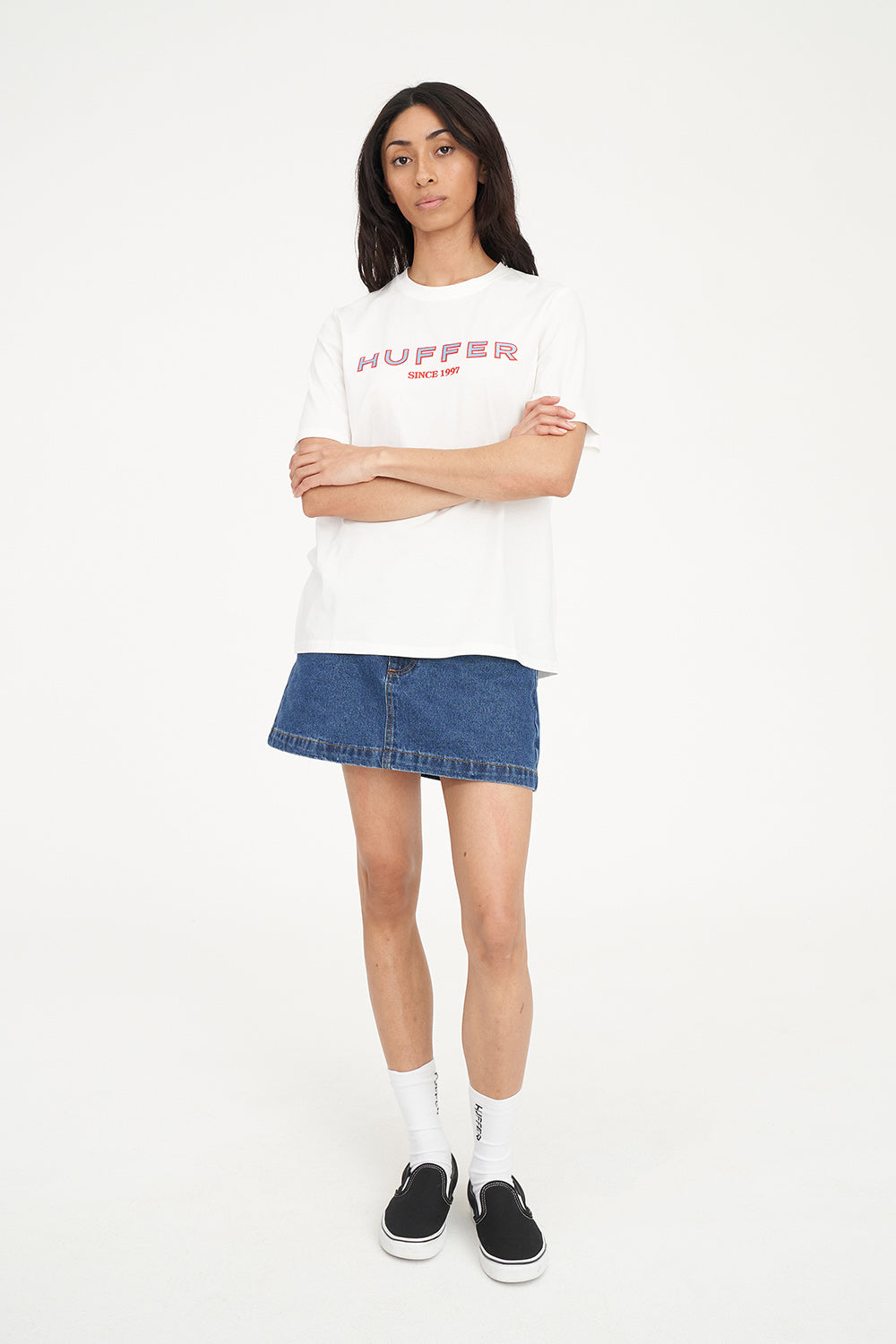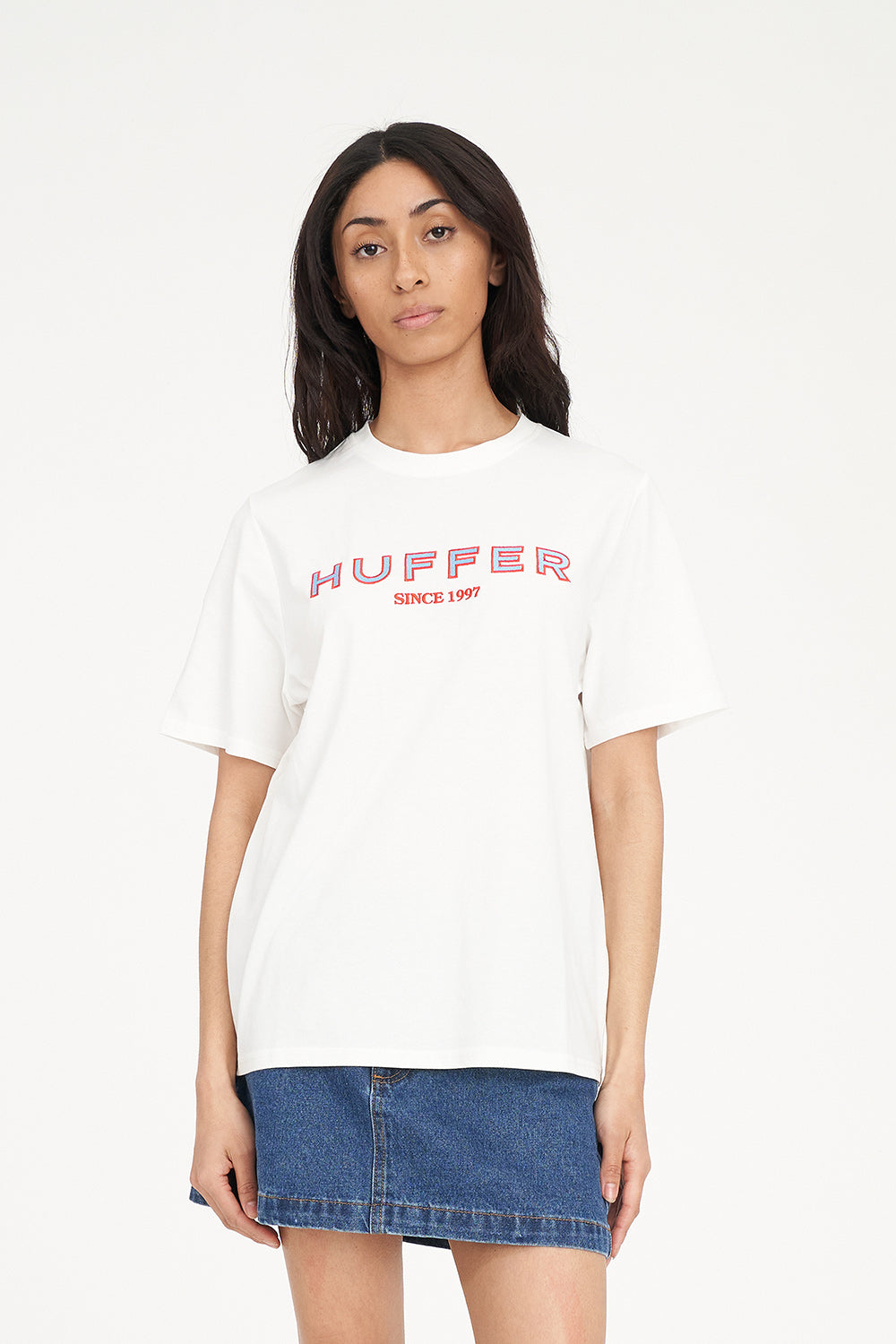 No fuss, just fresh • A classic that's good for the long haul • What you need to know: 100% Cotton / 170gsm, 15mm Neck rib / Standard weight jersey, Custom Huffer piece dyed colour, Classic fit, Short sleeve, Huffer branded placement embroidery