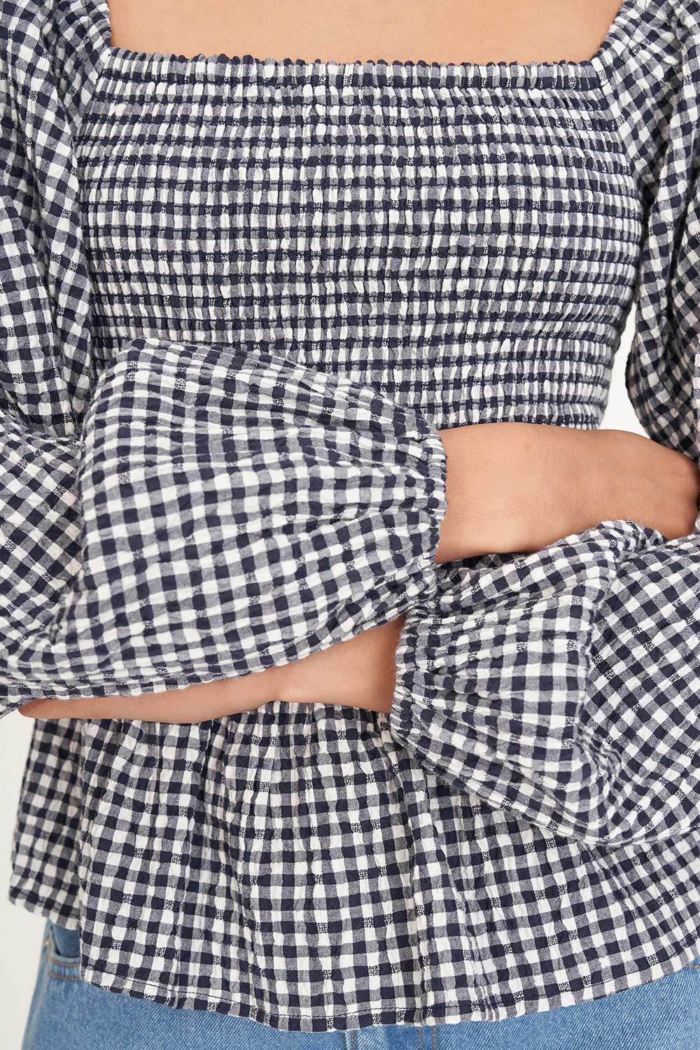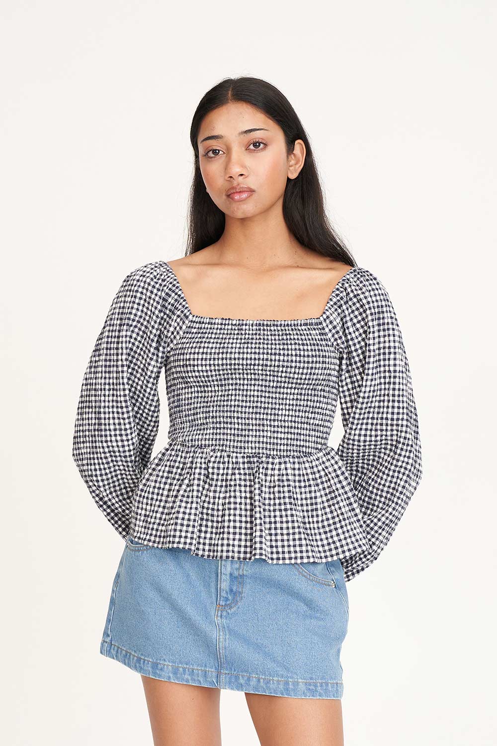 From desk to dinner in with ease • No hassles, just add your favourite jeans • What you need to know: 140gsm 90% Cotton 5% Elastance, custom Huffer gingham, long sleeve, elasticated cuffs, shirred bodice with a flared peplum hem