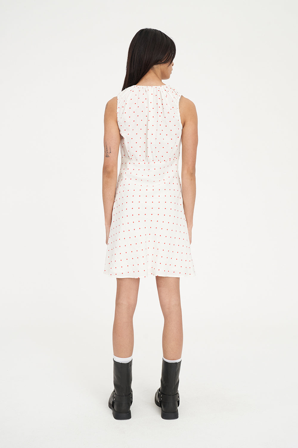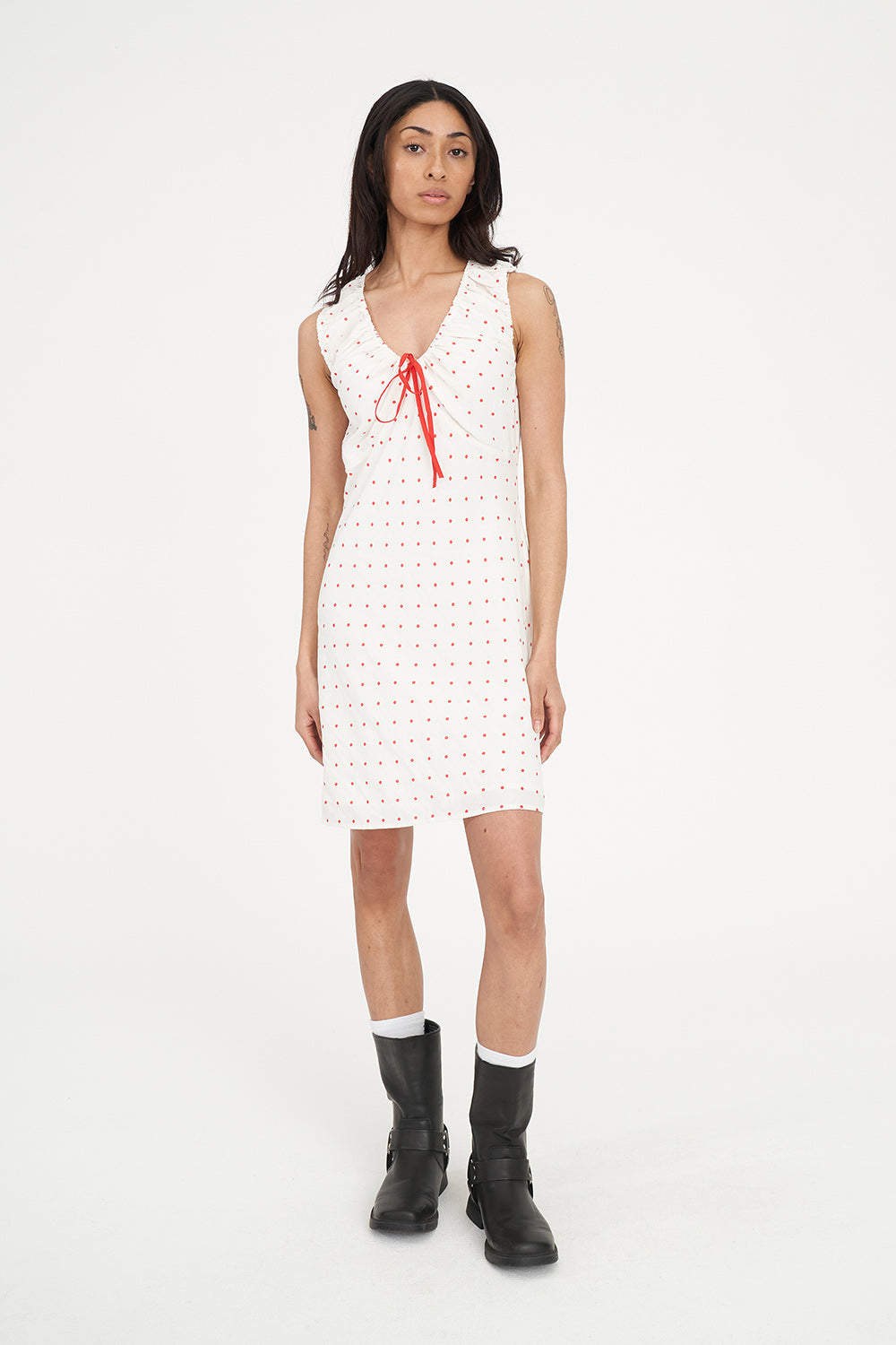 Dots on point, vibes on repeat • Dress it up or down- wear it your way • What you need to know: 70% Tencel 30% Linen, 140gsm, Custom Huffer yardage, V shape gathered neckline with adjustable tie, Bias cut, Mini length, Huffer branded placement embroidery
