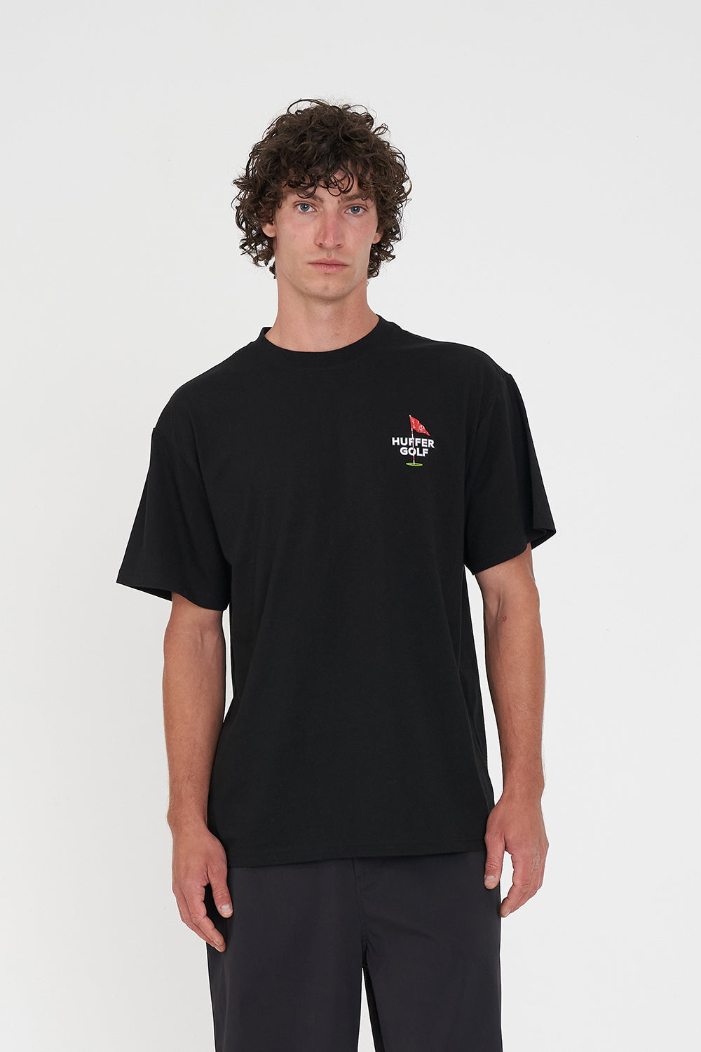 Huffer Golf • Whether you're chasing birdies, bogeys, or simply the vibes, we've dialled in fabrics that breathe, stretch, and stay fresh from tee off to the 19th hole. • Here's what you should know: 100% Cotton, 220gsm, 25mm Neck rib, Premium weight jersey, Relaxed fit, Short sleeve, Huffer branded placement screenprint